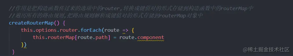 createRouterMap(){ //遍历所有的路规则,把路由规则解析成键值对的形式存储到routerMap对象中 //routes(这是存放路由地址的数组) this.options.routes.forEach( route => { this.routerMap[route.path] = route.component }) }