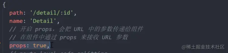 - 方式二:在配置路由时开启props(props:true),会把URL中的参数传递给组件,在组件中通过props来接受URL参数