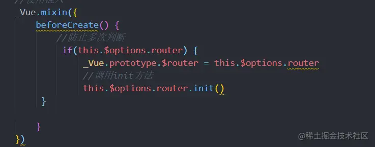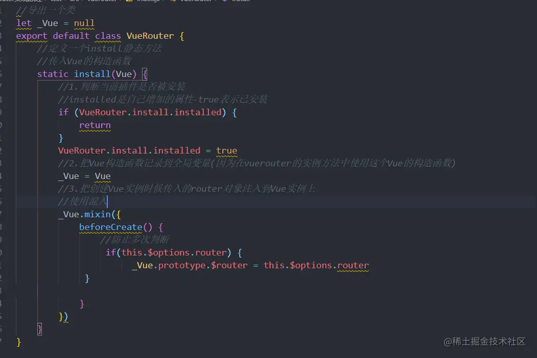 let _Vue = null //导出一个类 export default class VueRouter { //定义一个install静态方法,传入Vue的构造函数 static install(Vue){ //1.判断当前创建是否安装 //installed是自己增加的属性,true代表已安装 if(VueRouter.install.installed){ return } VueRouter.install.installed = true //2.把Vue构造函数记录到全局变量(因为vuerouter的实例方法中使用这个Vue的构造函数) _Vue = Vue //3.把创建Vue实例时候传入的router对象注入到Vue实例上 //使用混入 _Vue.mixin({ beforeCreate(){ //防止多次判断(判断是否存在路由) if(this.options.router){ _Vue.prototype.router = this.$options.router } } }) } }