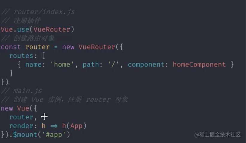 - 在创建vue实例的时候注册router对象(在vue实例对象中注册是因为在vue实例中创建注入route两个属性方法)
