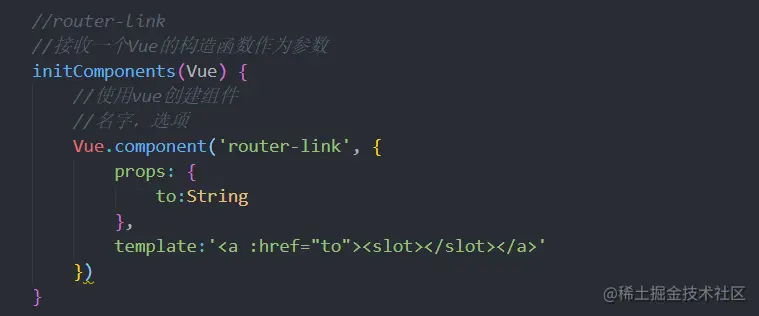 //接收一个Vue的构造函数作为参数 initComponents(Vue){ //使用vue创建组件 //名字,选项 Vue.component('router-link',{ props:{ to:String }, template:'' }) }