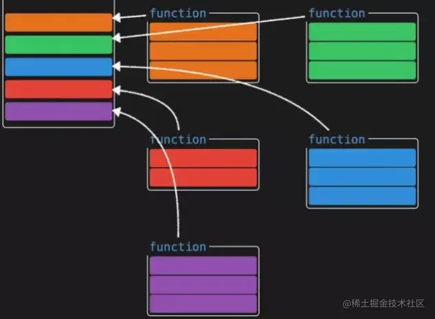 下面表示组件是一个大型组件(不同颜色表示不同逻辑),会看到同个功能逻辑的代码被分散到各处,这种碎片化使得理解和维护复杂组件变得困难,需要不断"跳"到相关代码处。