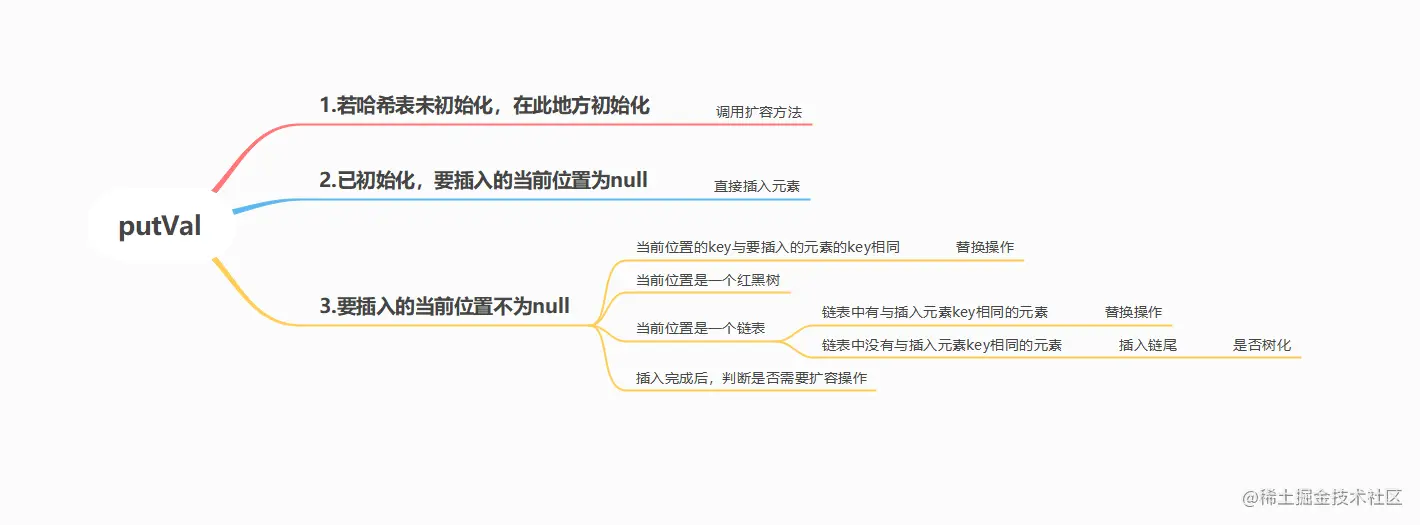 putVal()是插入元素的真正方法,但是它并不对外开放。先看以下脑图,大概就能知道putVal()插入元素的流程,