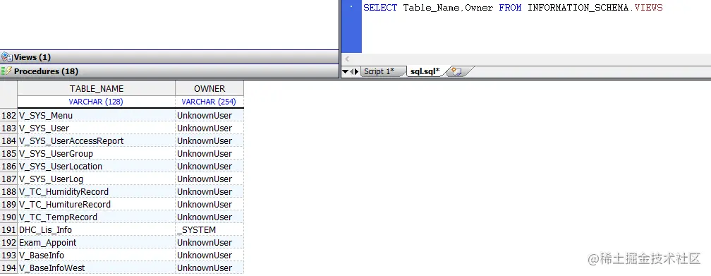 以下示例返回当前名称空间中所有视图的视图名称(Table_Name字段)和所有者名称:
