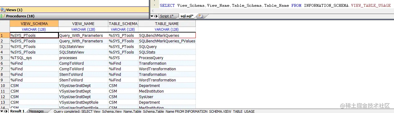 INFORMATION.SCHEMA.VIEWTABLEUSAGE持久类显示当前名称空间中的所有视图及其依赖的表。在下面的示例中显示: