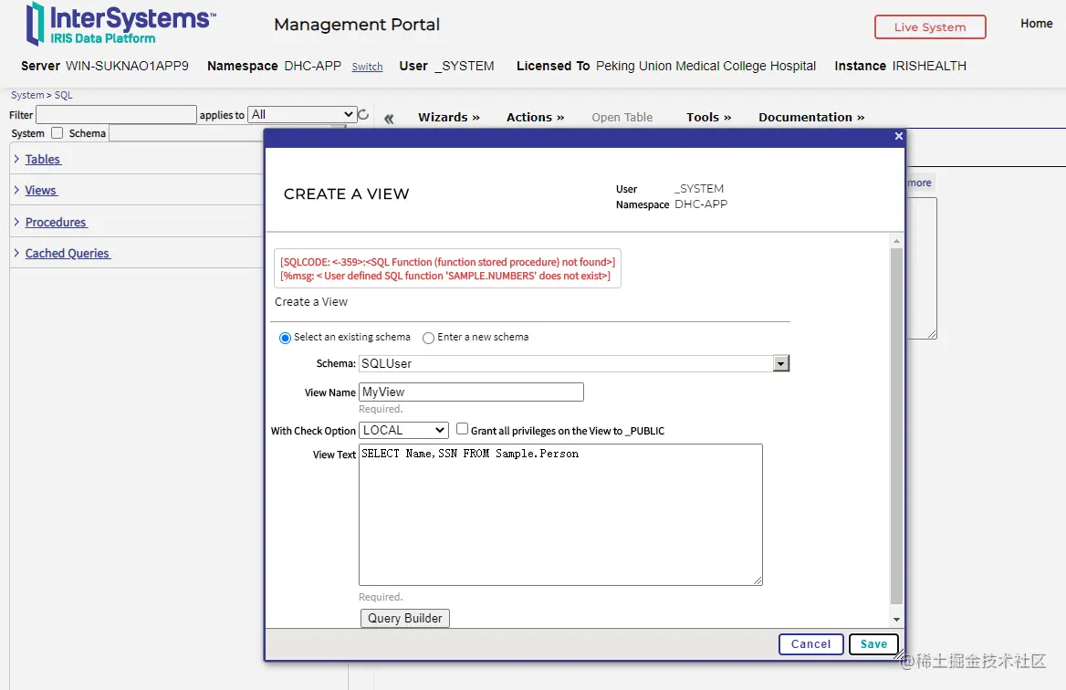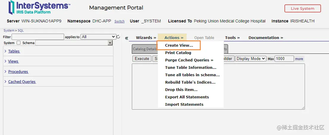 可以从管理门户创建视图。转到InterSystems IRIS管理门户。在系统资源管理器中,选择SQL。使用页面顶部的Switch选项选择一个名称空间;这将显示可用名称空间的列表。选择名称空间后,单击“操作”下拉列表,然后选择“创建视图”。