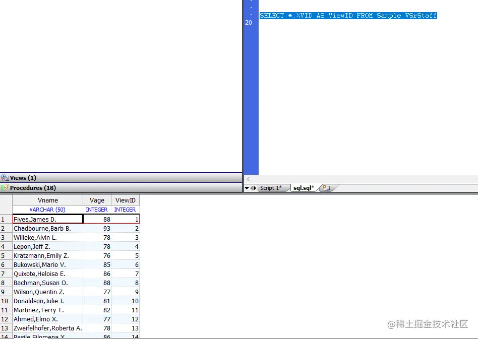 InterSystems IRIS为视图或FROM子句子查询返回的每一行分配一个整数视图ID(%VID)。与表行ID号一样,这些视图行ID号是系统分配的,唯一的,非空的,非零的和不可修改的。该%VID通常对用户不可见,并且仅在明确指定时返回。它以数据类型INTEGER返回。因为%VID值是顺序整数,所以如果视图返回有序数据,它们将更有意义。视图与TOP子句配对时,只能使用ORDER BY子句。以下嵌入式SQL示例创建一个名为VSrStaff的视图: