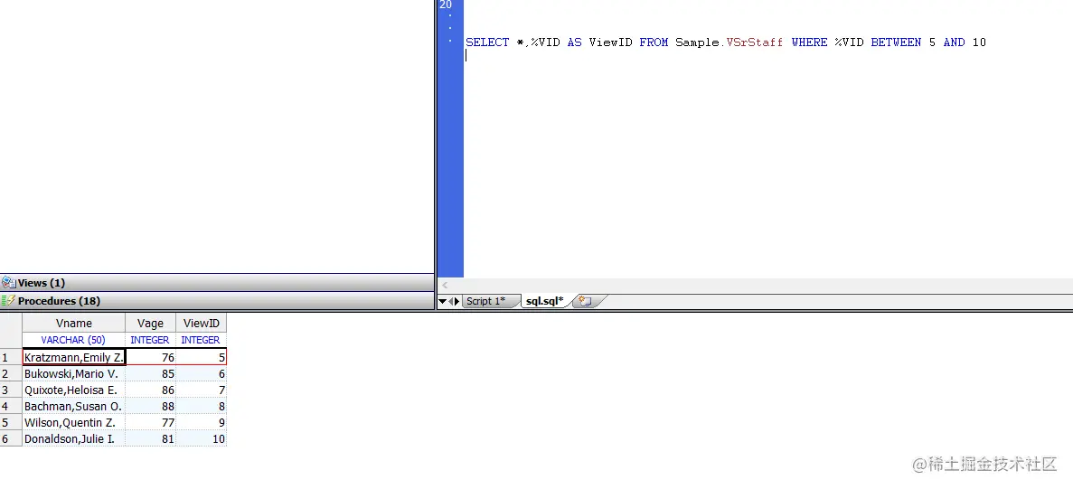 SELECT *,%VID AS ViewID FROM Sample.VSrStaff WHERE %VID BETWEEN 5 AND 10