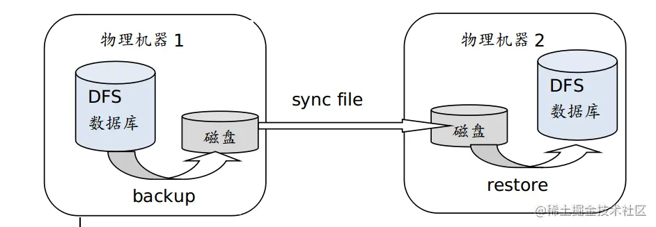 离线方式先把数据库中数据,通过DolphinDB内置的backup函数以二进制形式导入到磁盘,然后将数据同步到数据库所在的物理机器上,再通过restore函数将数据从磁盘恢复到到数据库。如下所示: