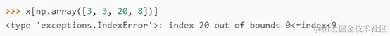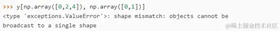 如果索引数组的形状不同,则尝试将它们广播为相同的形状。如果无法将它们广播为相同形状,则会引发异常: