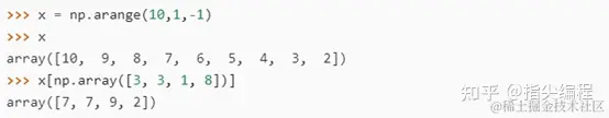 由3、3、1、8组成的索引数组将相应地创建一个长度为4的数组(与索引数组相同),其中每个索引都由索引数组在要索引的数组中具有的值替换。