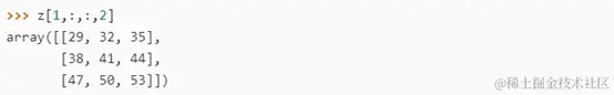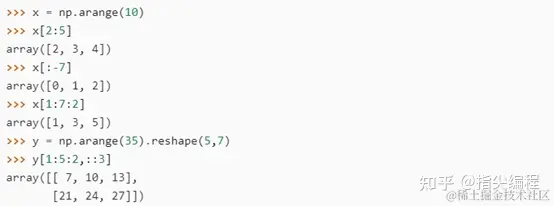 可以对数组进行切片和步进以提取相同数量的维,但数组大小与原始数组不同。切片和步进的工作方式与列表和元组完全相同,只是它们也可以应用于多个维度。例如: