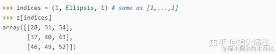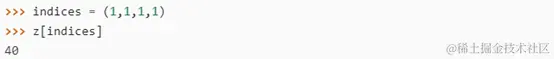 索引语法非常强大,但是在处理可变数量的索引时会受到限制。例如,如果你想编写一个函数,它可以处理不同维数的参数,而不必为每个可能维数编写特殊的代码,那该如何实现呢?如果向索引提供了一个元组,则该元组将被解释为一个索引列表。例如(使用前面对数组z的定义):
