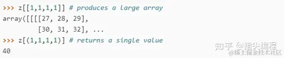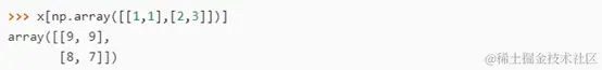 一般而言,使用索引数组时返回的是与索引数组具有相同形状但具有要索引的数组的类型和值的数组,我们可以使用多维索引数组,例如: