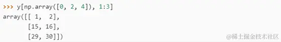实际上,切片和索引数组操作是独立的。切片操作将提取索引为1和2的列(即第二列和第三列),然后是索引数组操作,将提取索引为0、2和4的行(即第一行、第三行和第五行)。这等效于: