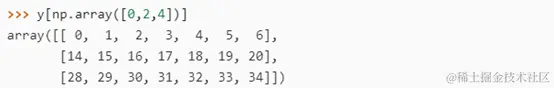 结果是构造了一个新的数组,其中索引数组的每个值从要索引的数组中选择一行,并且结果数组具有结果的形状(索引元素的数量,行的大小)。