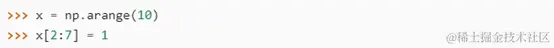 如前所述,可以使用单个索引,切片以及索引和掩码数组来选择要分配给数组的子集。分配给索引数组的值必须是形状一致的(与索引生成的形状相同或可广播)。例如,允许将常量分配给切片: