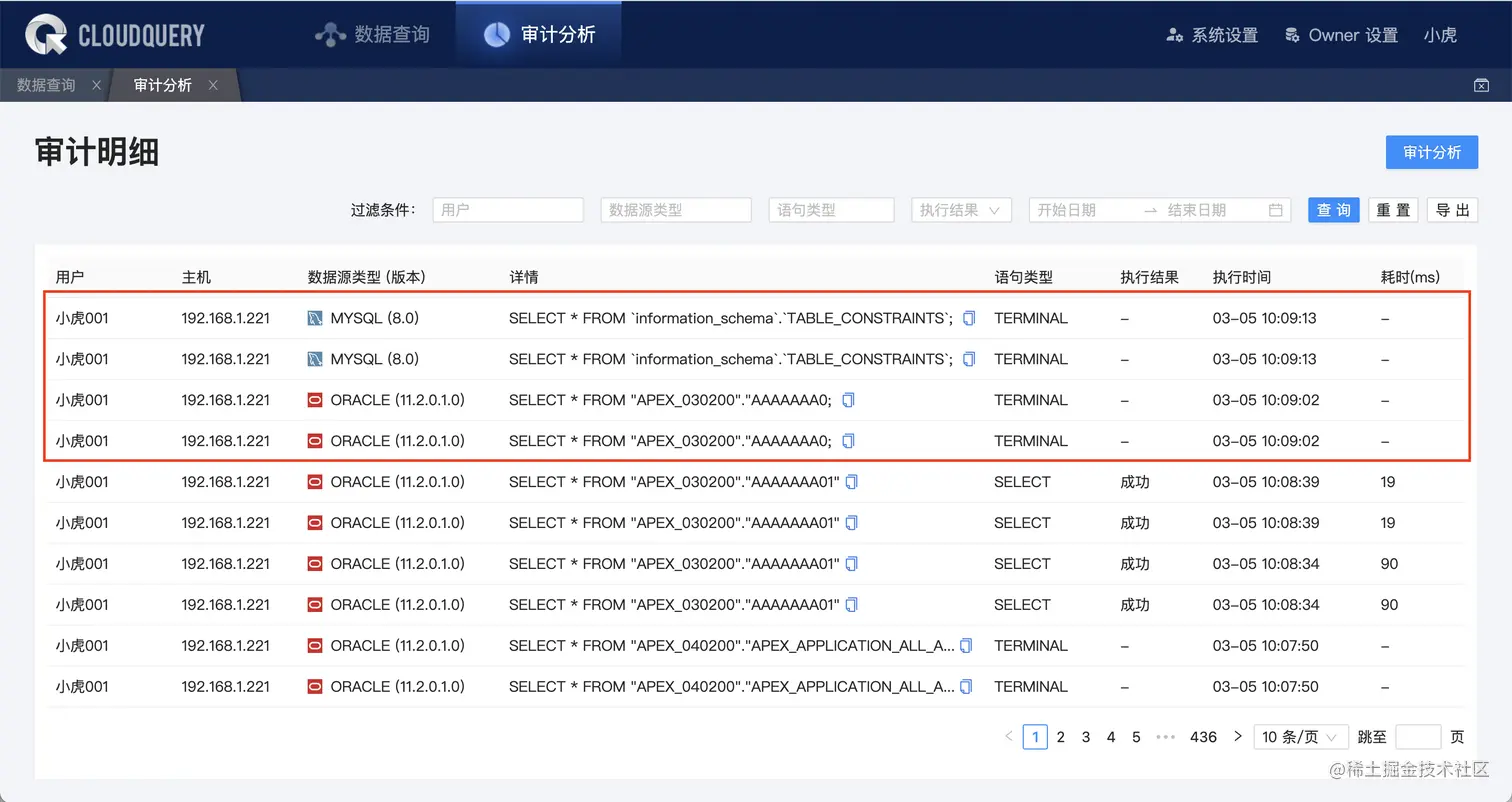 各数据库命令行终端中执行的语句被纳入审计分析,可在「审计明细」中查看。