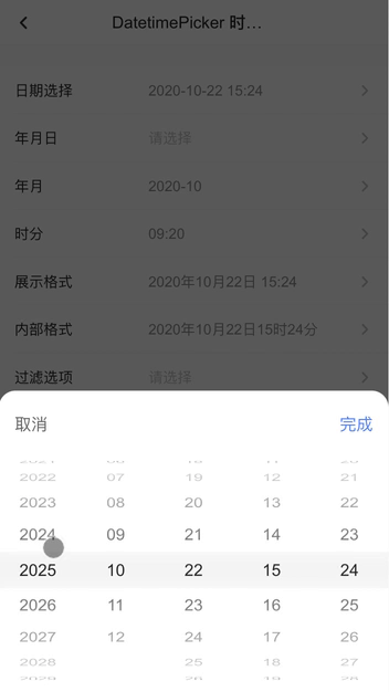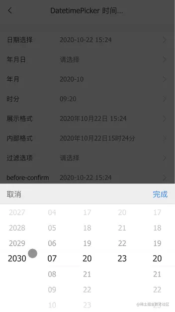 通过上面的示例可以看到,在2.0版本我们优化了时间选择器的交互效果,由原来的垂直拖拽式改为滚筒式,由2D动画转为了3D动画,在视觉的体验上更加精致,表现力更强。