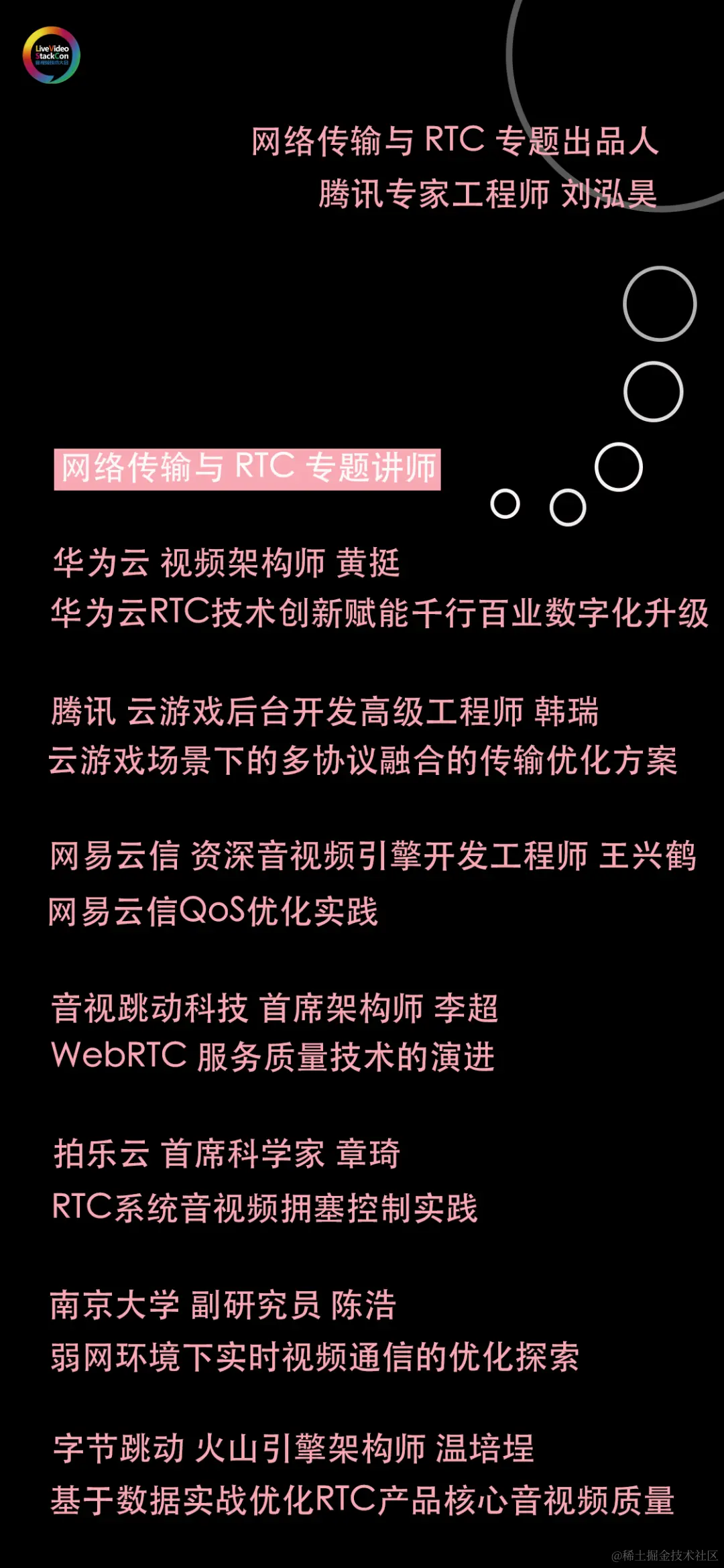 近几年,观众人数居高不下的场次一直集中在**“网络传输与RTC”专题**。因此,对于传输专题的讲师筛选,我们也向来严格。尤其今年,我们专门邀请到了腾讯 START 云游戏的刘泓昊做出品人,为专题的内容质量把关。