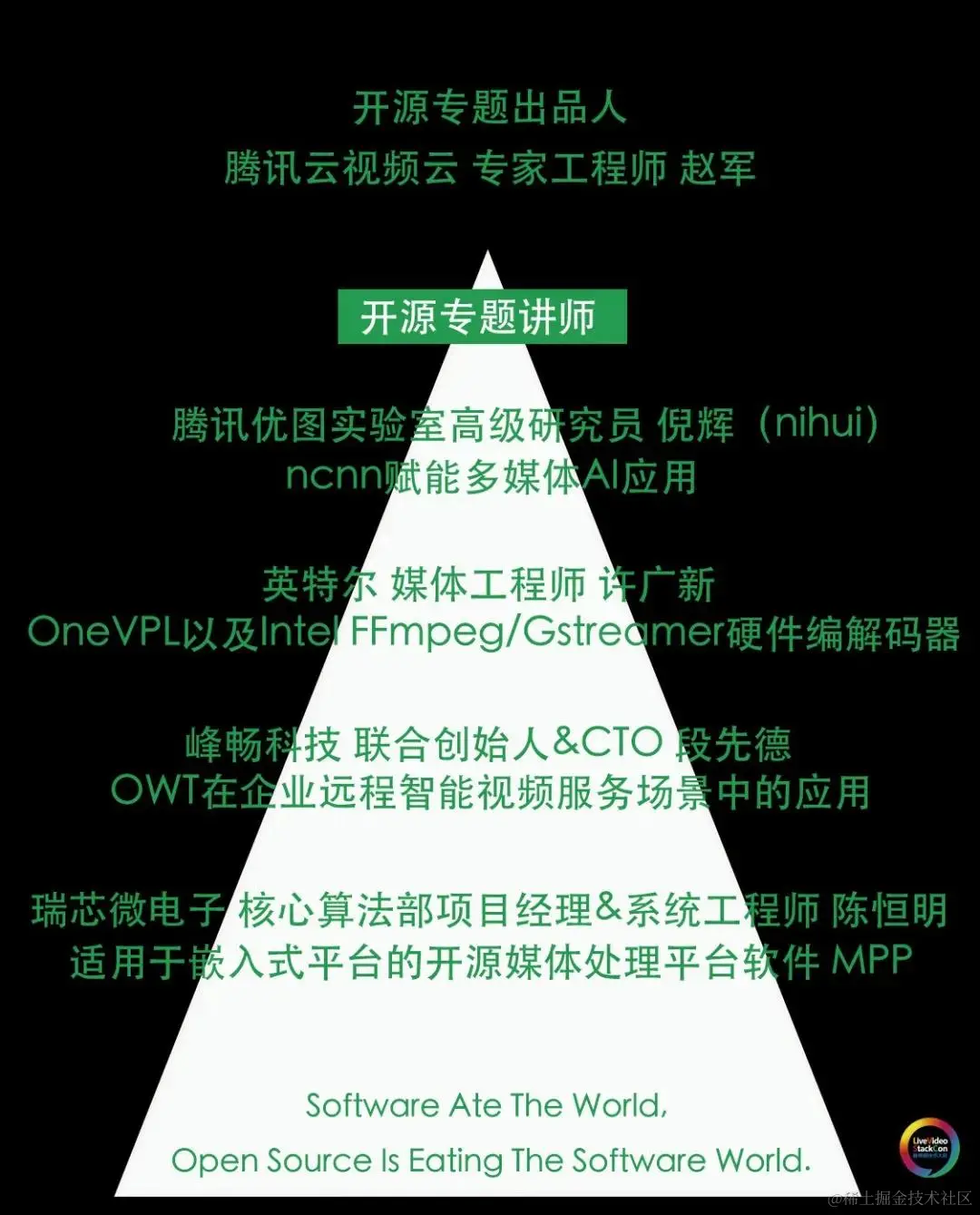 更有热情满满、常年温故知新的开源爱好者们齐聚一堂。**ncnn、FFmpeg、Gstreamer、OWT、MPP、AV1......**还是那一句——开源,无须多言。