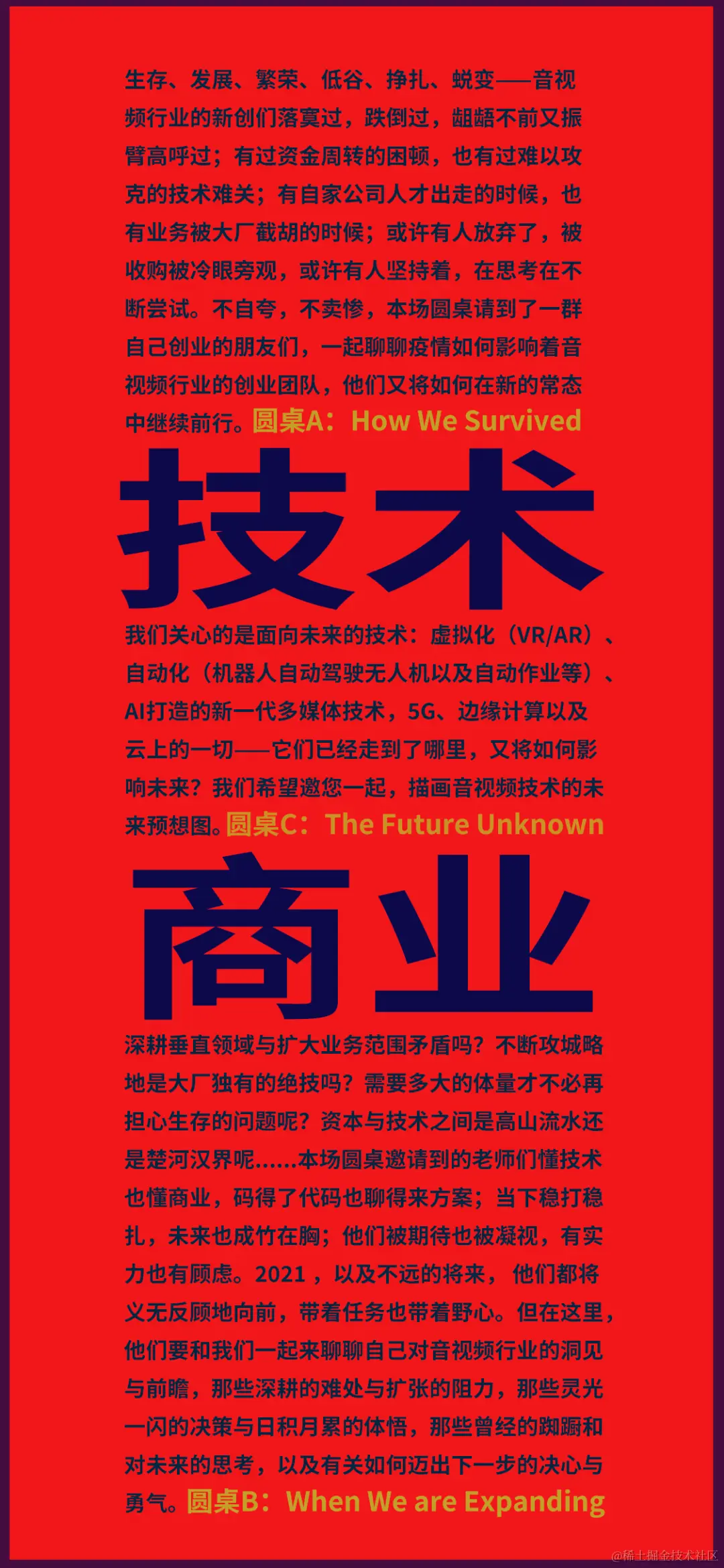 在邀请圆桌嘉宾时,我们也将邀请范围进行了相应的扩展。从学术界到工业界,从 CTO 到音视频垂直领域的投资人,从大厂到新创,从传统 CDN 到边缘计算与机器学习......也许有的新创你还不曾听说过,但通过他们,你将了解到多媒体技术在如何赋能轻工业与制造业,音视频的赛道哪里最拥挤哪里又出现了新的机会,如何不被大厂吃掉以及如何与大厂合作......当然,你也可以现场举手提问你最关心的问题。