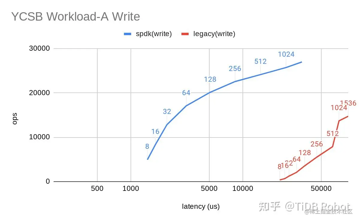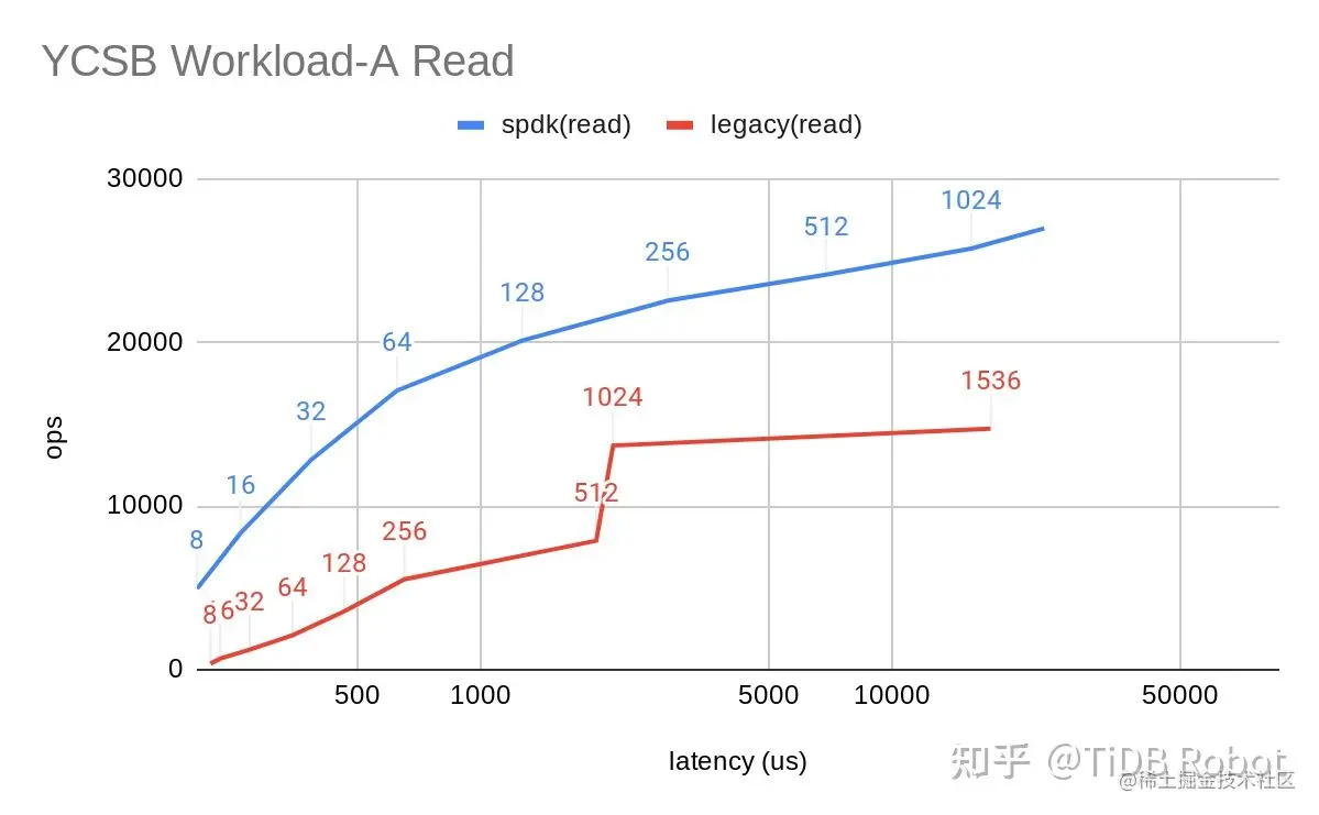 图中数据点的标签为客户端线程数,可以看出在容忍相同的延迟的前提下,基于 SPDK 的 TiKV 能够提供更高的 Ops 即更大的吞吐量。