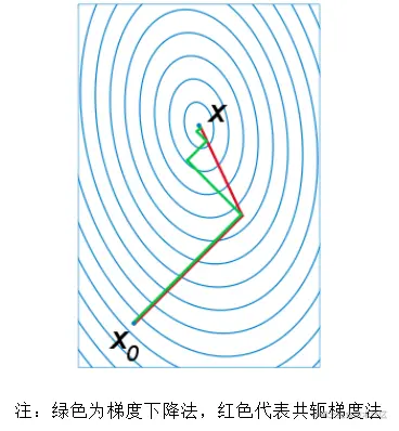 下图为共轭梯度法和梯度下降法搜索最优解的路径对比示意图: