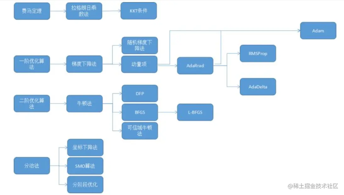 主要涉及分治法、动态规划、分阶段优化、SMO算法等等,这里不做主要介绍,在机器学习的优化中考虑使用的还是较少。