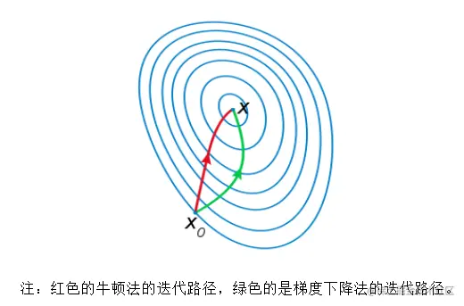 根据wiki上的解释,从几何上说,牛顿法就是用一个二次曲面去拟合你当前所处位置的局部曲面,而梯度下降法是用一个平面去拟合当前的局部曲面,通常情况下,二次曲面的拟合会比平面更好,所以牛顿法选择的下降路径会更符合真实的最优下降路径。