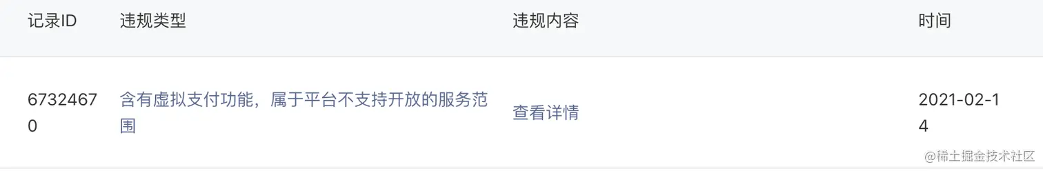 最近做微信小程序的付费项目,IOS端小程序直接调用微信的JSAPI下单。违规记录如图。IOS端是不允许含有虚拟支付功能。所以专用客服服务付款