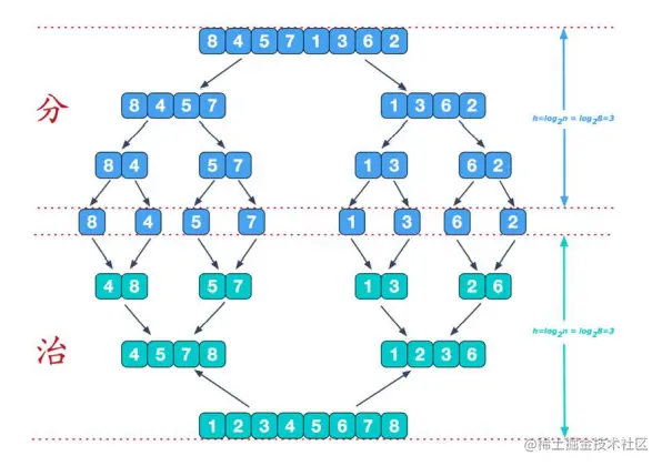 在下述案例中,主要的思想就是先将粒度不断细化,然后再进行比较,由于大粒度之间的比较是在小粒度的比较之后进行的,所以可以保证每个大粒度之间都是排好序的.这就是要求小粒度之间要有比较,排好序. divide阶段