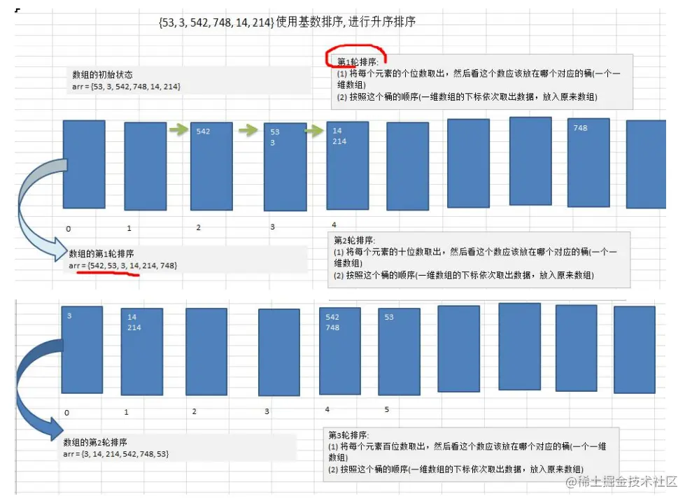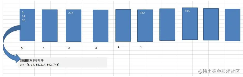 //定义二位数组桶,表示10个桶,每个桶应该容量为arr.length,防止溢出