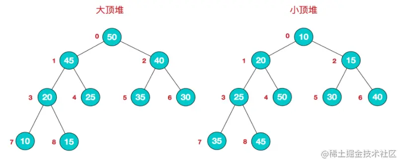- 小顶堆:arr[i] <= arr[2i+1] && arr[i] <= arr[2i+2]