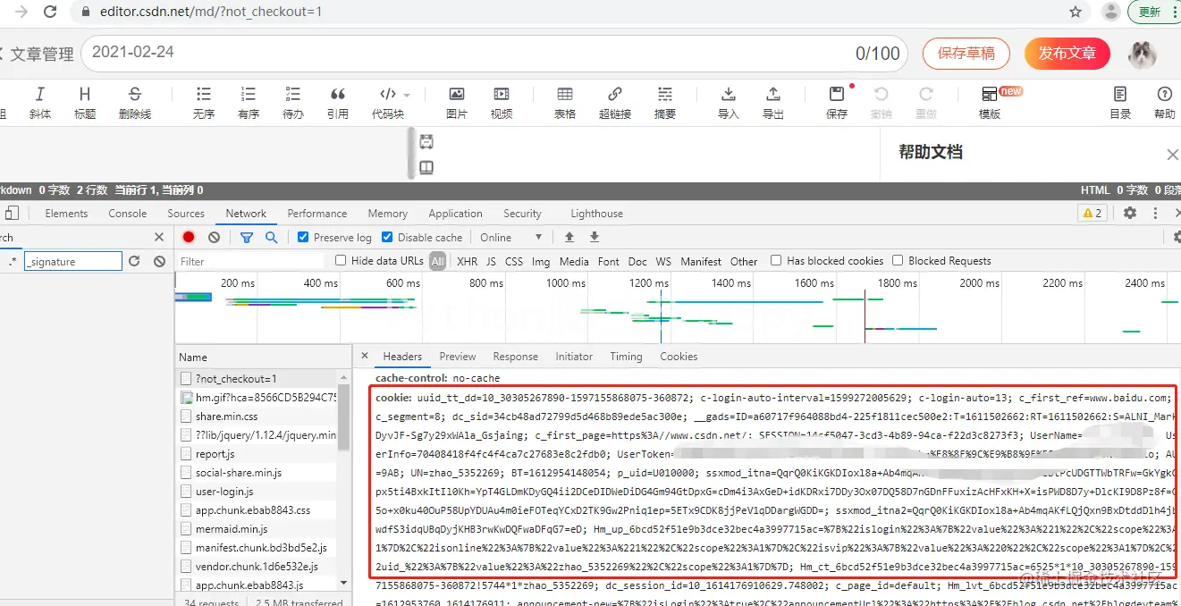 - CSDN 打开 CSDN,登陆,点击写文章,F12,点击刷新页面,点击第一个请求,找到 cookie,复制所有内容。也就是