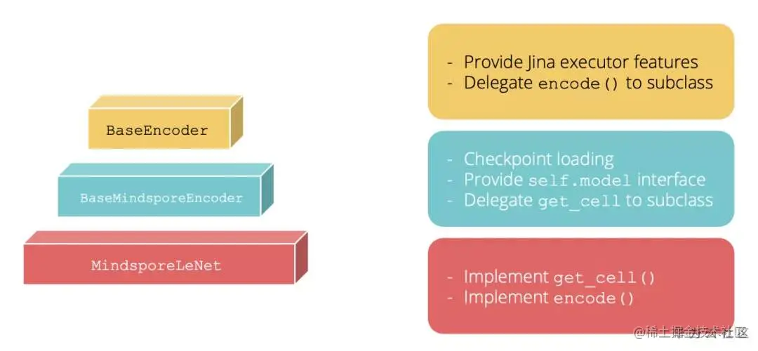 BaseMindsporeEncoder 是Jina中的抽象类,它在__init__构造函数中会导入MindSpore模型的checkpoint。此外,它还能通过self.model提供MindSpore模型的属性接口。下面这张表显示了MindSporeLeNet通过构造函数继承的类。