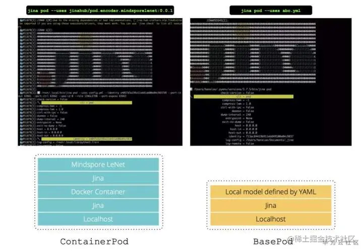 对比jina pod --uses abc.yml, 我们会发现jinahub/pod.encoder.mindsporelenet:0.0.1的日志信息的开头处有一个docker容器。这些log日志是从Docker的container传输到host端的,下面描述了两者具体的差异。