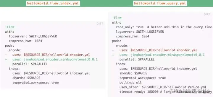最后,直接在index和search的flow中来使用新创建的MindSpore Executor吧,很简单,只需要替换pods.encode.uses这行代码就行: