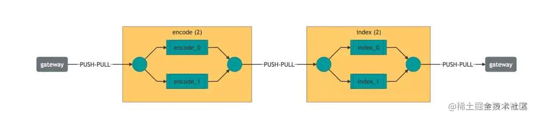 其实,这个flow中包含了两步(在Jina中也可以叫两个Pod):第一步它将数据通过并行的方式喂给encoder,输出向量和meta信息分片存储在索引器中。查询flow也是以同样的方式运行,只不过在参数上有些小变化。