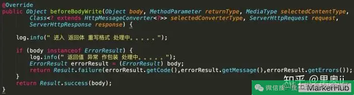 上面代码就是判断是否需要返回值包装,如果需要就直接包装。这里我们只处理了正常成功的包装,如果方法体报异常怎么办?处理异常也比较简单,只要判断 body 是否为异常类。