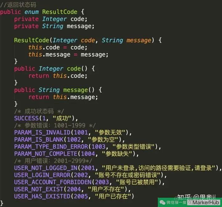 这样前端开发人员在得到返回值后,根据状态码就可以知道,大概什么错误,再根据 message 相关的信息描述,可以快速定位。