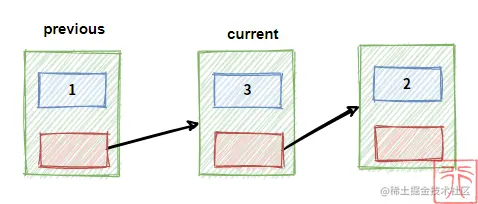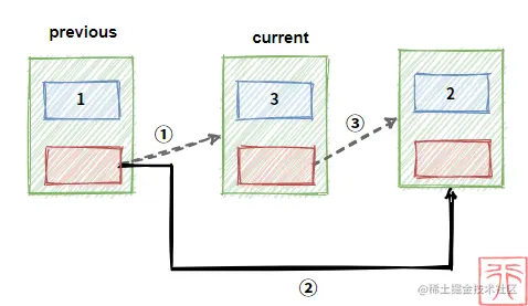 previous 和 current 为指向结点的指针,现在我们要删除结点 current,过程如下: