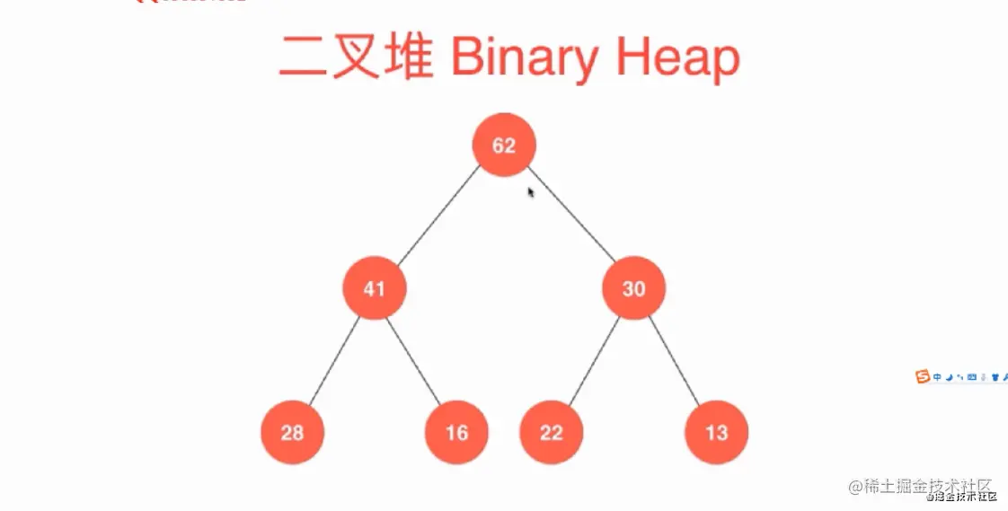 假设我们现在有一个最大堆,就是上图那个数组["",62,41,30,28,16,22,13,19,17,15]