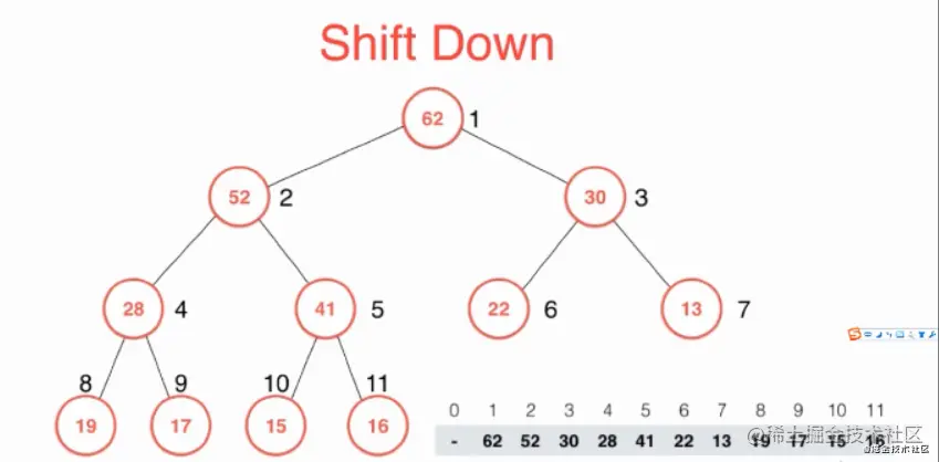 现在我们的数组是:[ '', 62, 52, 30, 28, 41, 22, 13, 19, 17, 15, 16 ]