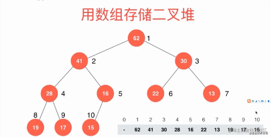 堆这种数据结构,依然是用数组来存储的,节点是有规律的,看下面这张图: