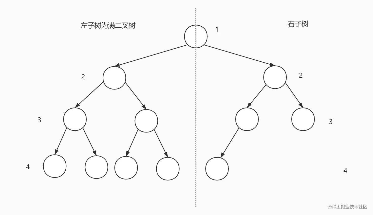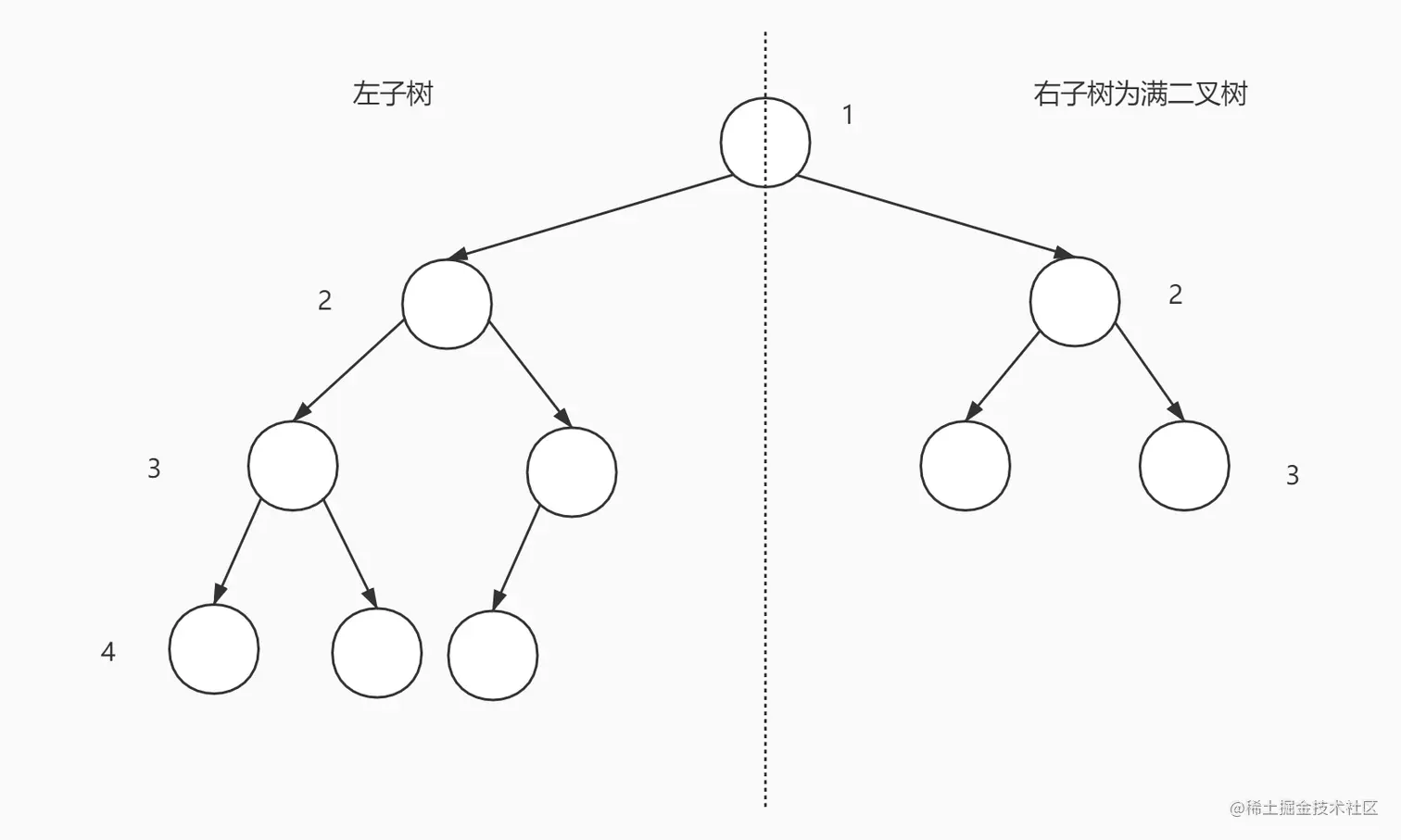 第二种情况如图所示,左子树为满二叉树,它的节点数可以通过公式得出