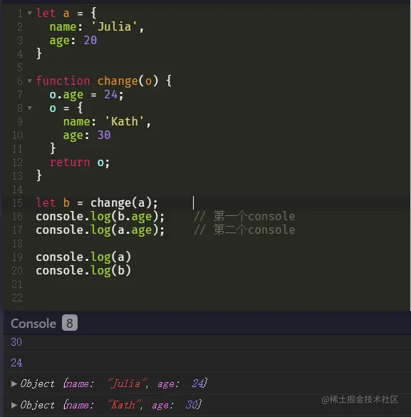 运行以上代码可以看出,第一个console打印b.age的值为30,第二个 console 的返回a.age的结果是 24,而最后分别打印了a和b的值,发现a最后返回的结果竟然是{name: "Julia", age: 24}。