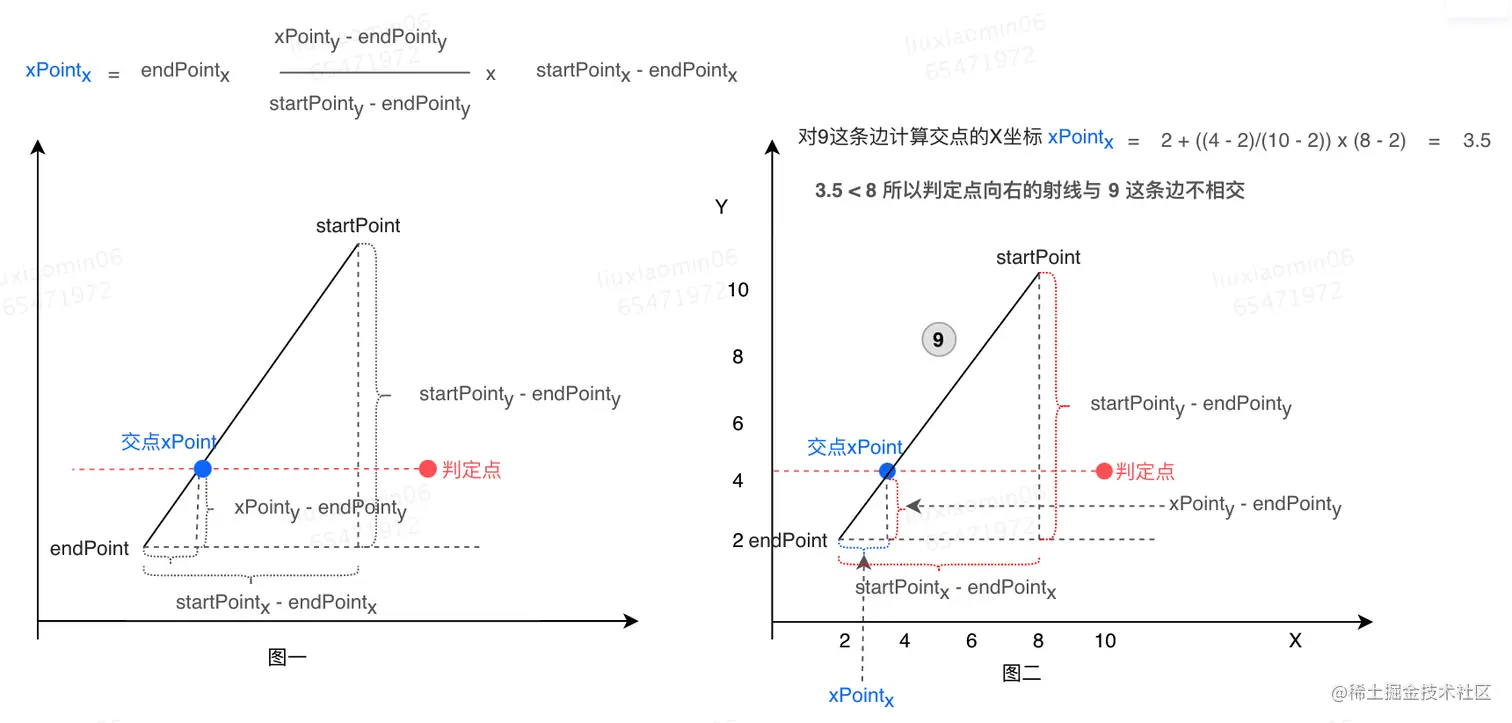 计算公示如下图一,同时我们以 9 这条边为例判断其是否与判定点向右的射线相交如下图二。