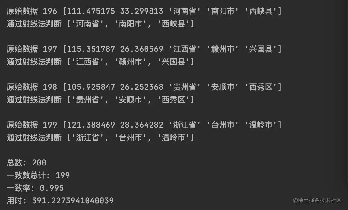 以上就完成了基于地理围栏的定位判断,下面是利用此算法判断一批经纬度所在的行政区域是否正确的例子: