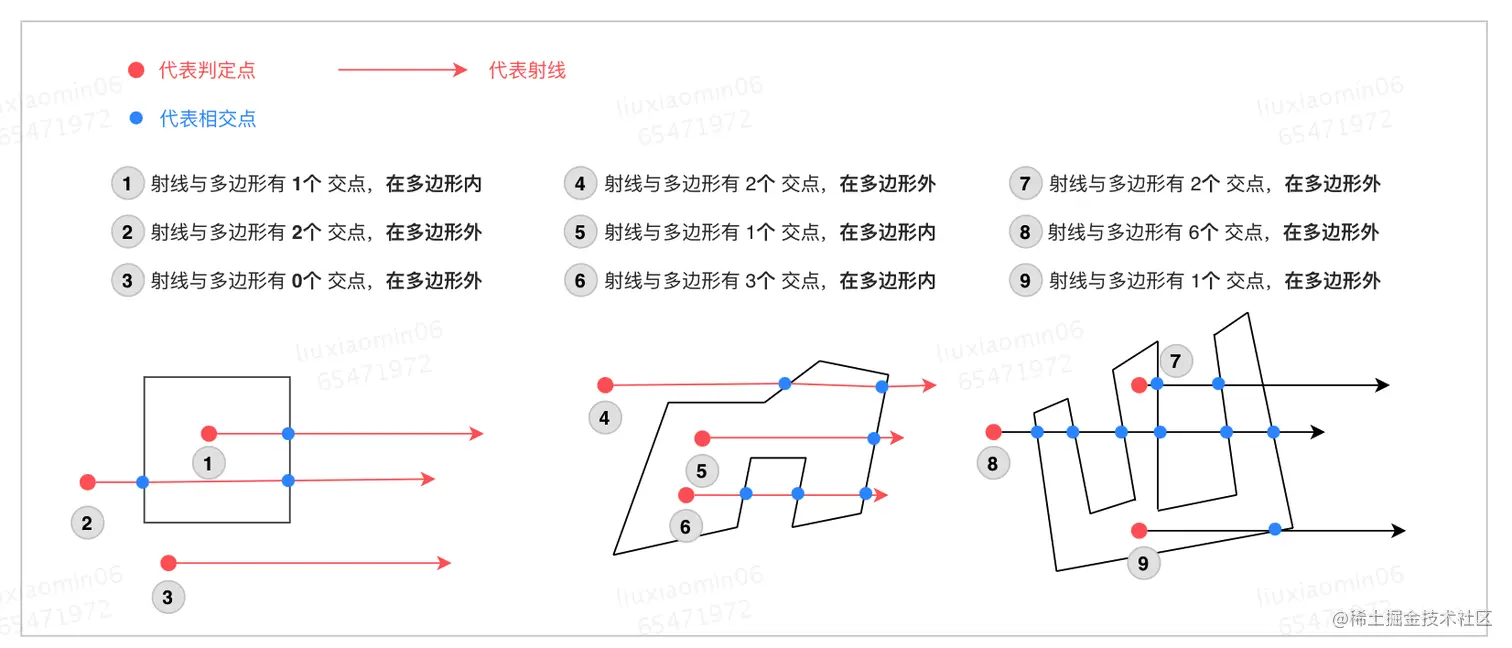 - 射线法:从判断点向某个统一方向作射线,依交点个数的奇偶判断;